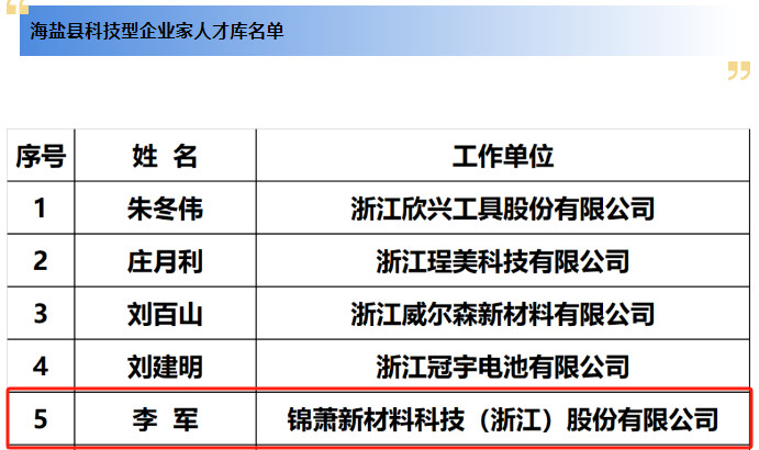 5月28日下午,嘉興海鹽圍繞“弘揚科學(xué)家精神,勇當(dāng)高水平科技自立自強(qiáng)排頭兵”活動主題舉辦了系列主場活動,正式公布了海鹽縣科技型企業(yè)家人才庫名單、海鹽縣最具創(chuàng)新力青年科技型企業(yè)家人才庫名單,共25位優(yōu)秀企業(yè)家入庫,錦蕭科技董事長兼總經(jīng)理李軍榜上有名。