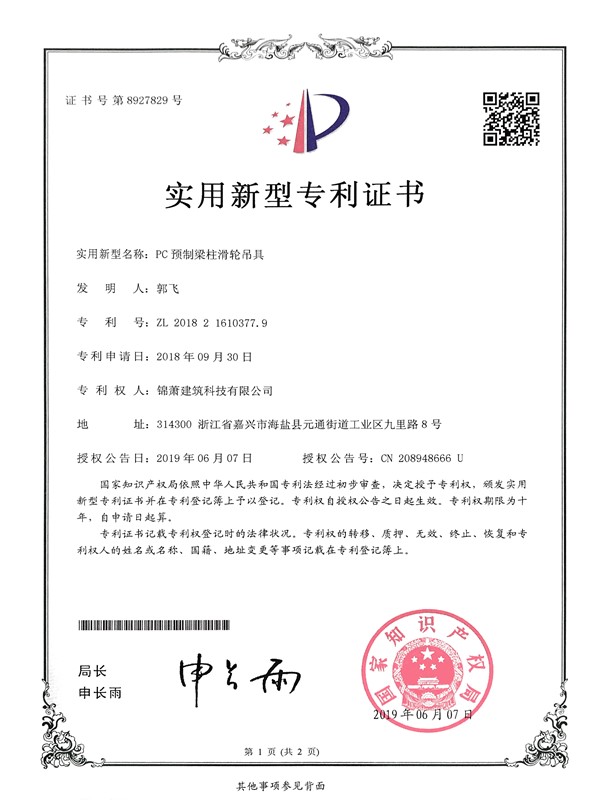 專(zhuān)利證書(shū)-PC預(yù)制梁柱滑輪吊具